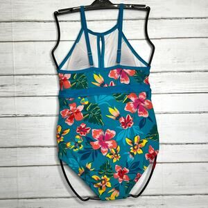 Lands' End High Neck Keyhole One Piece Blue Floral Swimsuit Size 10