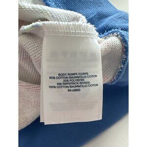 Colorful Lands End hoodie in a striking tye dye pattern of blue and yellow. Designed with a blue kangaroo pocket and blue cuffs & hem. Ideal for a size 18H.