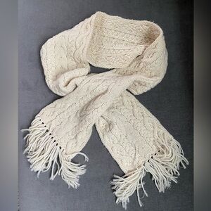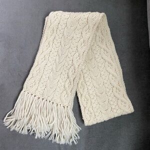 Lands End classic and cozy ivory cable knit scarf with fringe. This scarf is in good preowned condition. 66”x7” including fringe