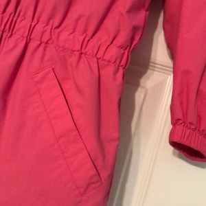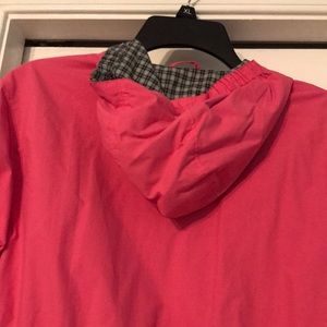 Girls jacket/ windbreaker. Zip front. Long sleeve. Hood. Pockets in front. Pink with checkered print in inside.