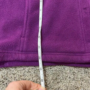 This vintage Land's End jacket is a must-have for any fashion-forward woman. The mid-length coat features long sleeves with button cuffs, an oversized fit, and a collared neckline. The jacket is made of polyester fleece with a solid pattern in a beautiful purple color.