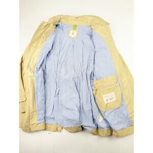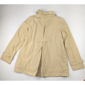 Lands' End khaki trench coat, size 7-8, very good condition, no stains or holes, Zipper and button closure. blue/white stripe lining. Back inverted pleat, belting accent in back and sleeve.