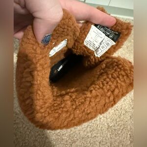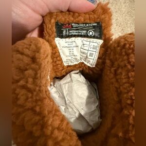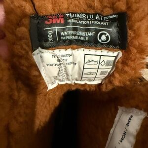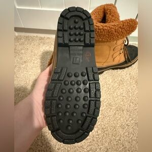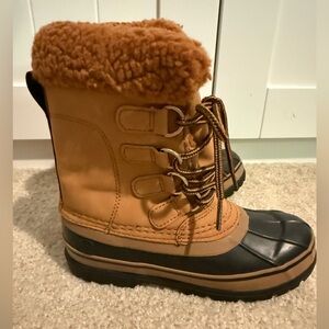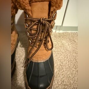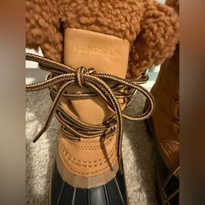 Warm tan and black snow boots by Lands' End. Features cozy fur lining and durable design.