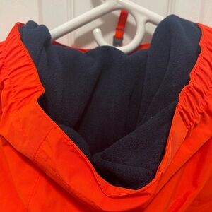 Stylish Kids jacket by Lands' End. Bright orange body with contrasting black sleeves. Features a hood and multiple pockets. Perfect for outdoor activities.