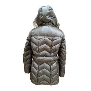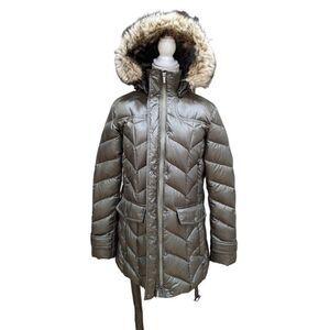 Land's End Knee Length Parka Quilted Puffer Faux Fur Hood Belted L 14-16 Olive