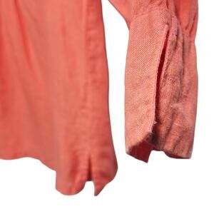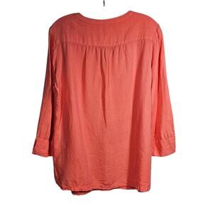 This is a gorgeous, coral, loose-fit, 100% Linen tunic from Lands' End in Women's Size 12P. The top has 3/4-length cuffed sleeves that can be worn up or down. A split hem allows for freedom of movement, and a split neckline with lace embellishment creates a V-neck. This piece is in EXCELLENT PRE-OWNED CONDITION. No flaws are noted.