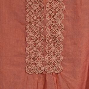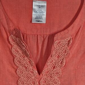 Lands End Linen Tunic Top Womens Size 12P Coral 3/4 Sleeve V Neck Lace Petite