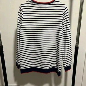 Elevate your casual wear collection with this classic Lands End Long Sleeve Shirt. Crafted with timeless style in mind, this shirt features a crisp navy and white striped pattern, adding a nautical touch to your everyday look. The shirt's neckline is tastefully accented with a red trim, coordinating beautifully with the subtle red detailing at the hem and cuffs, showcasing a harmonious blend of colors and a trademark of thoughtful design. Made from a blend of soft and durable materials, this shirt ensures both comfort and longevity. Its relaxed fit allows for ease of movement, making it a perfect choice for day-to-day wear or weekend outings. Ideal for layering or wearing as a standout piece, this Lands End shirt is a versatile addition to any wardrobe. Machine washable for easy care, this garment is as practical as it is stylish. Embrace the meeting of classic aesthetics and contemporary comfort with this must-have wardrobe staple.