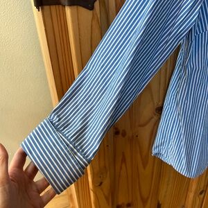 Women's Lands End long sleeve top, button up, collared, blue and white striped, ruffle, 100% cotton, size 12