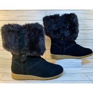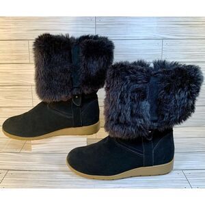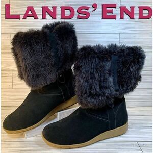 Lands End Mendota Tall Boots Black Suede W/ Faux Fur & Wedge Heel S:6.5