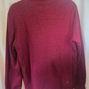 This Lands' End men's burgundy 1/4 zip sweater is perfect for casual wear. It features a solid pattern with black corduroy collar and a chest pocket with a zipper closure, ideal for keeping small essentials secure. The sweater is in great condition with no rips, tears, or stains, making it a reliable and stylish addition to your wardrobe.