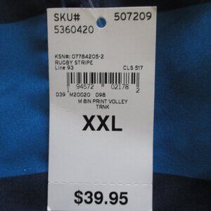 Lands' End Mens Rainbow Stripe Fully Lined Swim Trunk w/ (4) Pockets. Size 44W-48W or XXL, Inseam 8", Rise 14". 100% Polyester in Navy/Blue/Green/Yellow/Red Rugby Stripe. New with Tags, original M.S.R.P. $39.95, suitable for gifting.