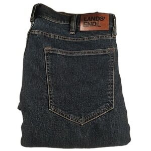 Upgrade your denim collection with this pair of Lands' End flannel lined stretch denim jeans. The solid blue color and straight leg style make them a timeless addition to your wardrobe. The jeans feature a zip and button closure, accented with a logo button and zipper detail.