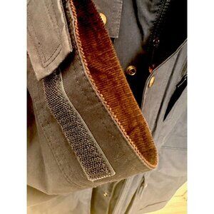 Flannel upper lining, Velcro adjustable wrist, 3 outside pockets- 2 w/flannel/corduroy lining, inside zip pocket, adjustable (cinch inside) waist, adjustable (cinch) hood, corduroy wrist lining, heavy duty.