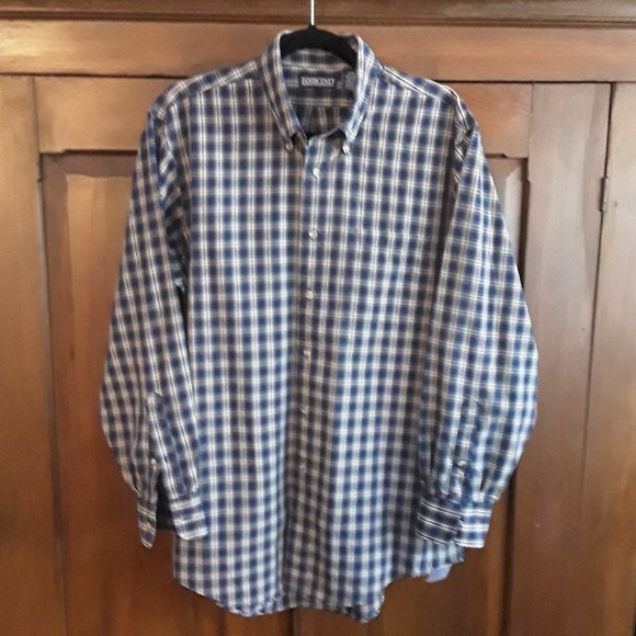 Gorgeous navy blue, brown & white 100% cotton plaid Regular Standard Dress Shirt Size 16-33. This is perfect for those business casual days. Button down collar & 1 exceptionally matched front pocket. Machine washable. Like new condition with no rips, stains or pills. This one is a great buy!