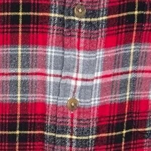 The soft shirt has a plaid pattern with shades of red, gray, white, blue, black and yellow and a front chest pocket.