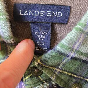 Tags/keywords: Flannel shirt, plaid flannel, button-up shirt, men's shirt, slim fit shirt, Lands' End clothing, casual wear, cotton shirt, long sleeve shirt, green plaid, purple plaid, men's fashion, gorpcore, lumberjack, rugged, country, rustic