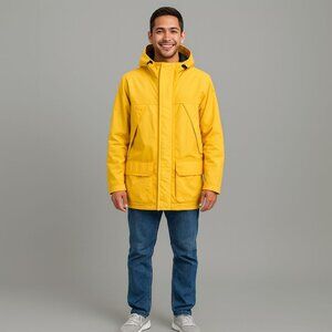Step out in style and stay dry with this Lands’ End Men’s Yellow Hooded Rain Jacket.