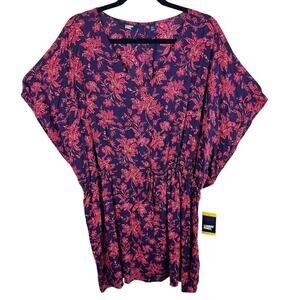 NWT. Purple & pink floral print short Dolman sleeve gathered waist lightweight above knee pullover cover up dress. Has tie at waist. 100% modal material. Approx. measurements: Shoulder to hem 38", pit to pit 21", waist across 19". Size M/L.