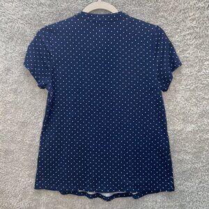 This Lands’ End short sleeve pintuck blouse is perfect for spring and summer. It features a lightweight fabric with a navy blue background and white polka dots. The pintuck front adds a touch of texture and elegance, and the flattering A-line shape provides a comfortable, easy fit. Great for casual outings or workwear.