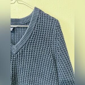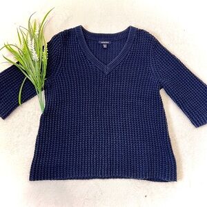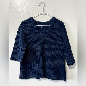 Cute and cozy Lands’ End branded pull-over sweater in a deep navy blue color, large waffle knit texture/pattern, v-neckline, boxy 1/2 sleeve length, ribbed neckline, oversized fit.