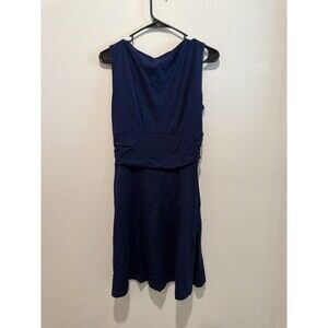 The Lands' End Navy Cotton Blend Dress in size S/P is a versatile and stylish option for various occasions. This knee-length dress features a flattering V-neckline, sleeveless design, and easy pullover closure. Made from a comfortable cotton blend material, this fit & flare style dress is suitable for travel, parties, formal events, and business settings. The classic solid blue color and stretchy fabric make it a timeless choice for the summer, fall, and spring seasons. Perfect for those who appreciate a blend of elegance and practicality in their wardrobe.41