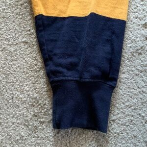 Classic Lands' End rugby with bold navy and gold stripes. Long sleeves and a white collar add a timeless touch. Ribbed cuffs. Three button front closure. Labeled as men’s but could be worn by anyone. See photos and measurements.