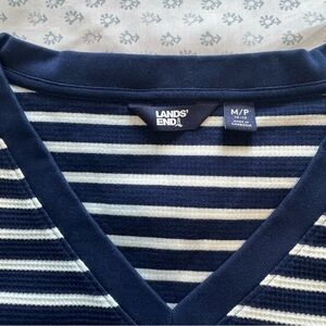 Stylish Lands End navy and white striped V-neck top for women. Perfect for casual outings.