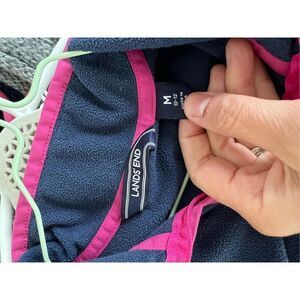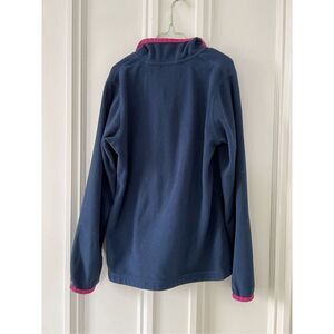 Lands’ End size 10-12, navy blue fleece top with hot pink trim, with some minor wear but still has lots of life.
