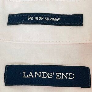 Lands' End No Iron Supima Cotton button up blouse in soft blush pink. Measures 19" armpit to armpit, 22.5" neck to tail, 22" sleeve. Excellent condition with no holes, tears, stains, or ripped seams. Smoke free, pet friendly home.