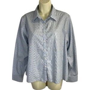 100% supima cotton no-iron button front blouse. Blue and white stripe pattern with multicolor mini polka dot overlay.