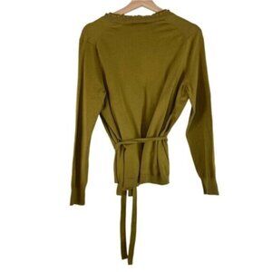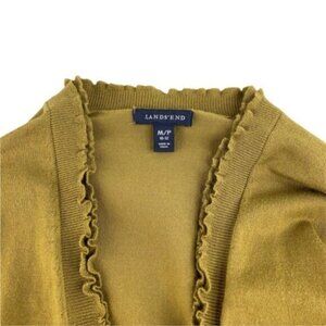 Lands End Olive Green Cardigan Belted. Size medium. Ruffled trim collar. Excellent used condition.