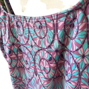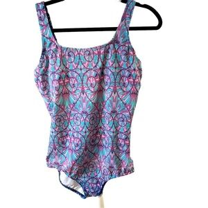 Lands End One Piece Swimsuit Women 12 DDD Teal Mauve Geometric Design Lined