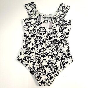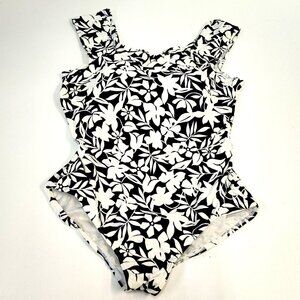 This exquisite one-piece swimsuit by Land's End combines timeless elegance with comfortable functionality. The graceful black and white floral pattern, paired with the tugless low-leg design, ensures ease of movement and a secure fit. A charming V-back cut-out detail elevates its style, making it a sophisticated choice for leisurely days by the water.