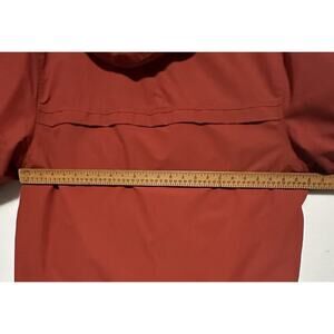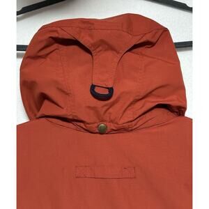 This is a men's orange jacket from Lands' End, made in China. It features a windproof and water-resistant exterior, with a polyester fleece lining for added warmth. The jacket has a removable hood, cinched waist, and snap, zip, and hook-and-eye closures for versatility. It also includes pockets for convenience. The jacket is designed in a solid pattern and has a long length, making it suitable for travel, casual wear, and business occasions. The chest size is 37 inches, and the jacket is a size L. The overall style is an overcoat with a preppy, 90s USA theme.