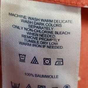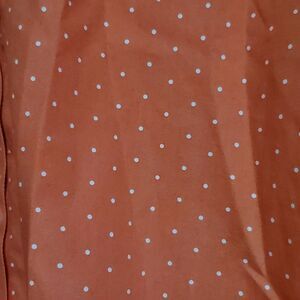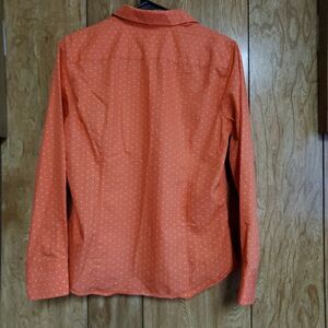 Cute button down shirt, with playful white polka dots, and a fun orange color that's just right for Fall. Made from 100% Baumwolle Cotton and the tag says, "No Iron" but it does look like it might could use a light steam.