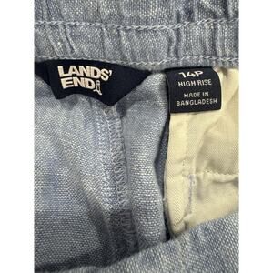These Lands' End pants are women's size 14P in a stylish blue color, made from 100% linen with a high rise and wide-leg fit. Perfect for various occasions such as travel, casual outings, or workwear, these pants feature a zip closure, elastic waist, and pockets for convenience. With a relaxed fit and solid pattern, these pants can be worn in any season and are machine washable for easy care. Ideal for those who love coastal, nautical, or tropical themes, these pants offer a blend of comfort and style.