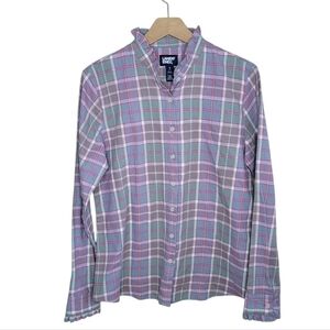 Lands' End | Pastel Purple Pink Green Plaid Flannel Shirt with Ruffle Details.
