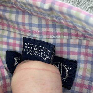 This Lands' End petite shirt features a classic checkered pattern. Crafted for comfort and style, it offers a versatile design suitable for various settings.