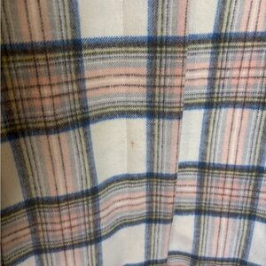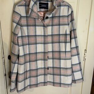Elegant plaid coat by Lands' End. Features soft peach and blue highlights. Ideal for a sophisticated style. Pit to pit 28” top to bottom 30”