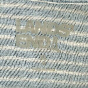 This Lands' End polo shirt features a stylish blue stripe design with a Johnny collar and 3/4 sleeves. Made from 100% cotton, it offers comfort and breathability for everyday wear.