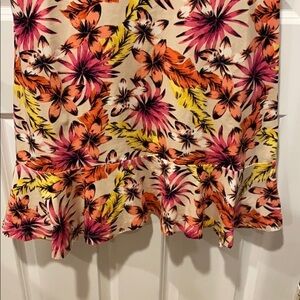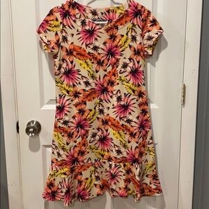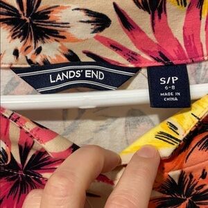 Small Lands End cotton dress. Flirty ruffle hem, notch in neckline, your favorite tee shirt in dress form. Pretty floral print, perfect to toss on over a swimsuit and go to dinner.