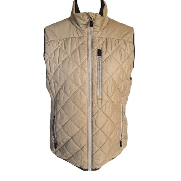 Women's Land's End tan gold sleeveless mock neck fully lined zip up puffy vest, size small 6-8. This has PrimaLoft microfiber insulation, brown interior, three front zippered pockets. Machine washable. Made in Vietnam. Excellent like new condition and from a smoke free pet free home. Quick shipper!