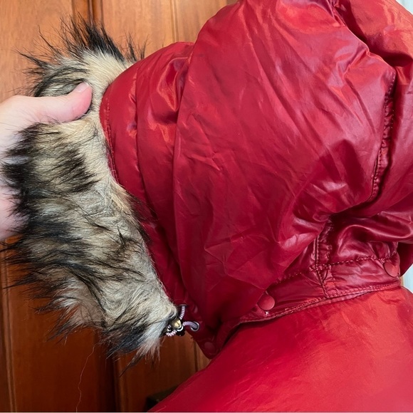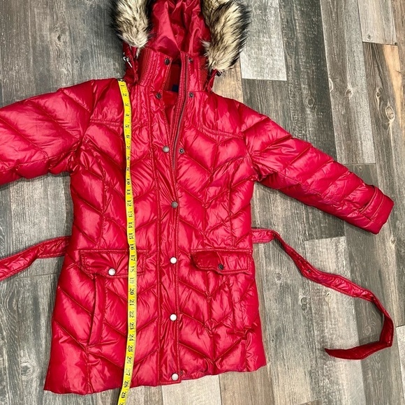 Lands’ End Puffer Jacket Faux Fur Hood Dark RED Belt Waist Down Fill Sz Small