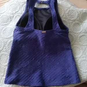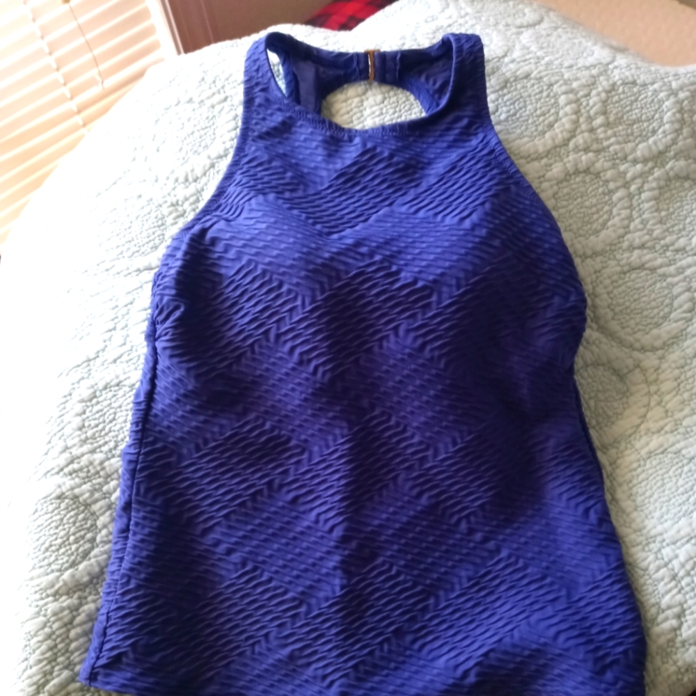 Puckered periwinkle colored athletic top. Built in bra with hook at the neckline. Excellent pre loved condition.