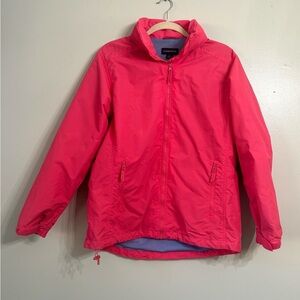 Lands End Pink Rain Coat / Jacket. Features a Hidden Hood & Blue Mesh lining. Has Adjustable waist cinches, Adjustable hook and loop wrist closure, zippered pockets, and a back vent. Excellent Condition. No flaws.