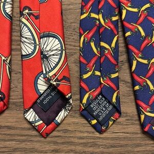 Vibrant ties with unique designs. One features bicycles on a red background. The other showcases Chili peppers on a blue background. Perfect for adding flair to any outfit.