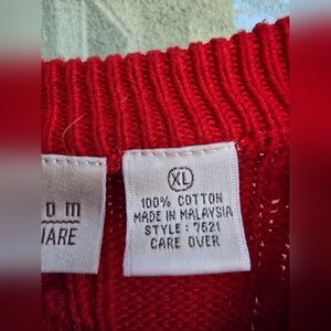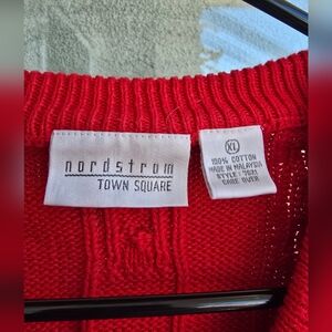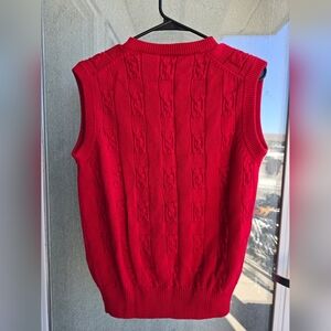 Vibrant red cable knit sweater vest. Sleeveless with a V-neck design. Perfect for layering.