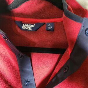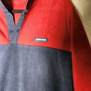 Wrap yourself in the cozy embrace of this Lands' End pullover fleece sweater. The vibrant red and navy hues evoke a sense of classic adventure, perfect for crisp autumn walks or fireside chats. Crafted from 100% polyester, it promises warmth and durability, making it a steadfast companion for your journeys.