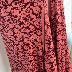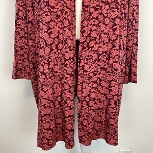 Lands End Red/Pink Floral Midi Length Open Front Cardigan/Sweater. Plus Size 2X. In very good preowned condition. No stains. Reddish pink with a pink floral print. Has pockets. Armpit to pit measures 24 inches. Total length 36 inches. Comes from a smoke free home.